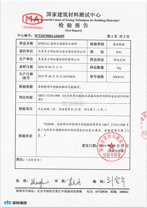 (雨虹HWR101高耐水超柔防水涂料可用于生活饮水检测报告)