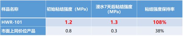 经试验对比:初始条件相同,7天后,雨虹HWR101高耐水超柔防水涂料与市面上同价位产品,粘结强度保持率仍优秀。