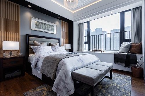 Galaxy床超高软包床头,和Galaxy梳妆凳的呼应奠定了主卧的舒适格局,左右Galaxy床头柜+床头台灯的对称布局,与背景墙协调搭配,更与客厅方正的轮廓形成呼应,中式风格的竹栅、水墨印染床品、飘窗茶桌,竹篮收纳以及仿真花的点缀,同样达到东西融合的平衡之美。