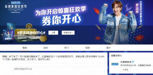 其中,微博话题#罗志祥券你开心#上线仅3个小时,阅读量便迅速攀升至6000多万,众多微博大V、网友也持续加入到话题讨论当中。不仅如此,红星美凯龙还力邀11位头部抖音红人打造“QUAN11”天团,推出吸睛态度海报,引爆全民疯狂打call;值得一提的是,红星美凯龙集结数百位行业大咖,化身“11.11全球家居狂欢节造势官”联合助阵,狂欢盛况空前。