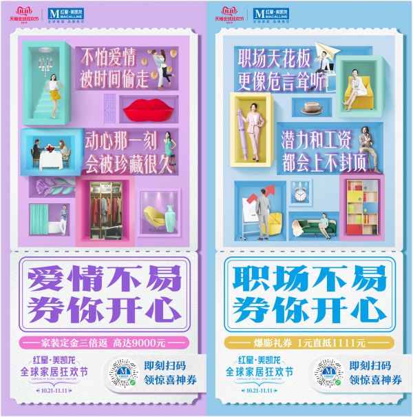 11月1日,一组“券你开心”系列态度海报扎心上线,透过职场、爱情、买房、追梦四组经典场景,红星美凯龙还原“我太难了”的现实话题,迅速刷屏网络,不少网友笑称“太真实”、“简直句句戳中”。