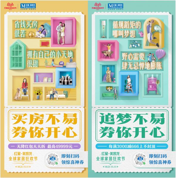 通过这组海报,红星美凯龙不但敏锐洞悉到年轻人“我太难了”的焦虑,而且巧妙地以“券”字新解鼓励年轻人转换视角,要勇于尝试打破现实和理想的差距。如海报所言,“职场天花板更像危言耸听,潜力和工资都会上不封顶”、“不怕爱情被时间偷走,动心那一刻会被珍藏很久”、“省钱买房很苦,拥有自己的小天地很甜”、“循规蹈矩的哪叫梦想,野心需要肆无忌惮地膨胀”。也正是凭借这些积极豁达的主张,红星美凯龙再一次用年轻、潮流、有力量的态度,与年轻群体达成深度契合。