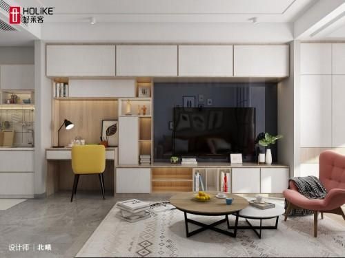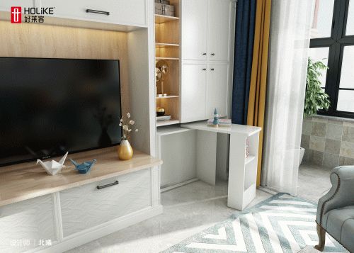 特别推荐:原态k板定制组合电视柜,利用原态k板专属定制组合柜,同时实现多种功能,颜值超高且实用翻倍。依靠电视柜的空间开辟出一方办公区,收纳、办公两不误,功能合并了,客厅颜值依旧。电视柜的一个角落设置小型的好莱客伸缩书桌,不用的时候收起来毫不影响美观。