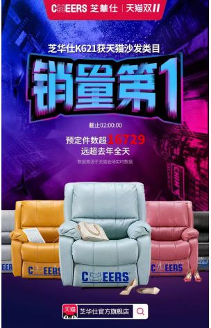 在近日天猫公布的2019双十一爆款清单里,知名软家居品牌芝华仕爆款单品K621功能单椅再度入选,这也是自芝华仕入驻天猫以来连续4年入选爆款清单。