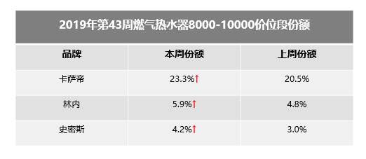 据中怡康发布的第43周燃热市场数据显示,8000-10000价位段行业整体上涨2.8个百分点。其中,卡萨帝份额同比上周增幅2.8%、史密斯增幅1.2%、林内增幅1.1%。