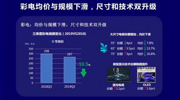 10月29日,中国家用电器研究院和全国家用电器工业信息中心联合发布《2019中国家电行业三季度报告》,2019三季度彩电国内市场规模同比增长率-10.5%,市场自2018年四季度以来,开启连续四个季度下滑态势,低迷成为常态。