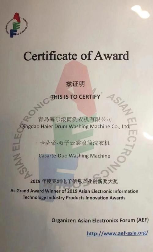 卡萨帝双子云裳洗衣机获亚洲电子信息产业创新奖大奖