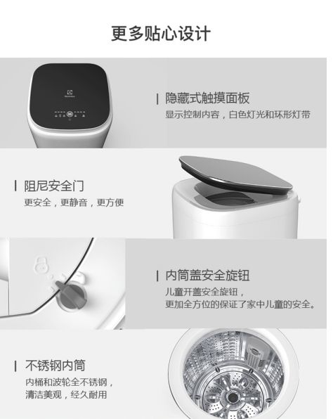 俗话说:“麻雀虽小,五脏俱全”。别看这款产品体型小巧,但是各种贴心设计却一点都不少。隐藏式触摸面板可清晰地显示控制内容,白色灯光和环形灯带也为大家带来了十足的科技感。该款mini洗衣机安装阻尼安全门,安全、静音更方便。内桶盖安全旋钮的设置,全方位地保证了家中儿童安全。或许不少宝妈会担心,这么小的洗衣机动力会不会没那么足。这个大家可以完全放心,伊莱克斯配置高性能优质电机,采用高密封性优质钢材,再结合航空润滑油,从而确保洗衣机平稳运转,有效增强动力,运动也更加顺畅。