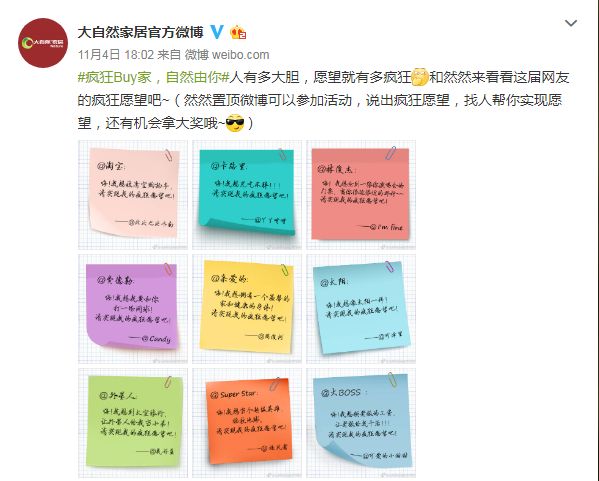 这组疯狂愿望海报引发刷屏后,大自然家居还通过微博微信自媒体带动这届网友,发起以#疯狂Buy家,自然由你#的话题,让大家都说出自己的疯狂愿望,甚至还鼓励网友直接@能帮自己实现愿望的人,直接隔空喊话要求实现疯狂愿望,引发大波网友的围观转发。
