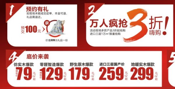 而大自然地板的线下万人疯抢活动现场也是疯狂不止,低至三折的“疯狂”价格,还搭配预约有礼、集团补贴等丰厚福利放送。同时,活动现场多个爆款底价放送,地暖实木地板爆款299元/㎡起,制造原料零醛添加,生产过程零醛污染的零醛智造爆款裸板价129元/㎡起, 简直是健康环保和优惠福利双重暴击呀!