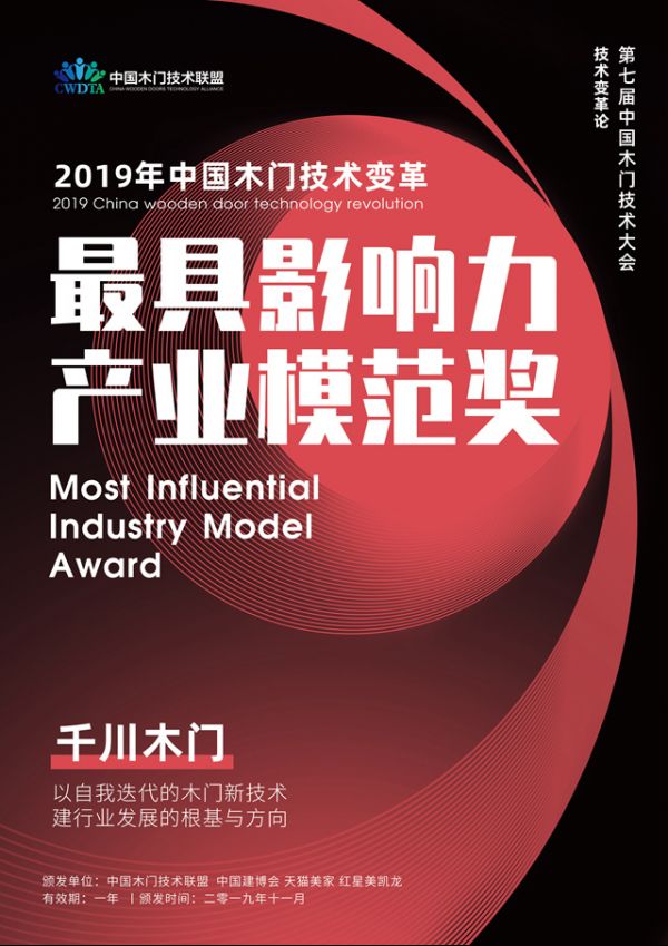 千川木门荣获2019第七届中国木门技术大会“最具影响力产业模范奖”!