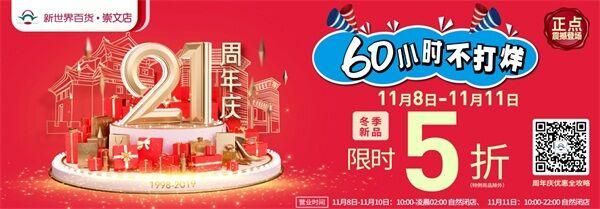 更多支付便捷方式、出行无忧让顾客60小时轻松买无忧购;这么多超级好省、联手、特仅、便利无忧的尊享仅在11月8-11日新世界百货-崇文门店60小时不打烊。