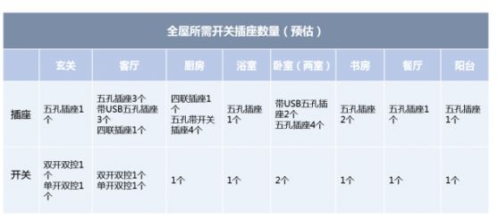 新房的户型是二室一厅一厨一卫一书房,需要的开关插座数量如下图,大约需要开关插座近40个,乍一看数量会很多,但当真正布局起来会觉得刚刚好。这里提醒大家,插座数量一定要预留到位,不然到时候不够用,再外接排插会非常杂乱。