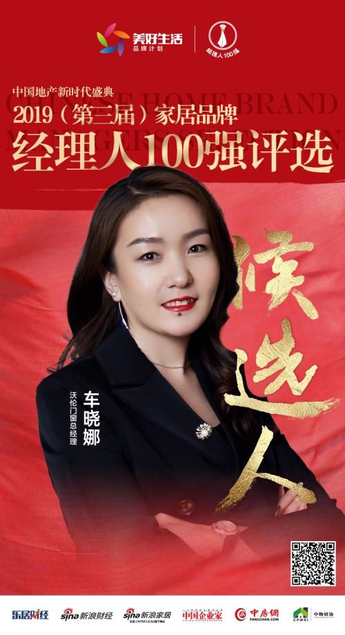 新浪家居讯由乐居财经、新浪财经、新浪家居、中国企业家、中房网联合主办,中国房地产业协会、中国物业管理协会、全国工商联家具装饰业商会共同指导的“家国同梦——2019年(第三届)中国家居经理人评选”活动正式启动。沃伦德邦门窗(北京)有限公司总经理车晓娜获媒体提名,进入“2019中国家居品牌经理人100强”评选。