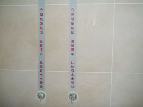 今朝装饰在瓷砖完成后,粘贴专用水电改造贴提醒后期施工人员,在施工时避开墙内管道,安全施工。