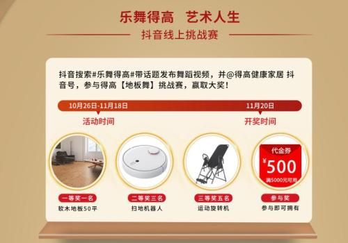 “乐舞得高,艺术人生”抖音舞蹈挑战赛依然在火热进行中。抖音搜索#乐舞得高#带话题发布舞蹈视频,并@得高健康家居 抖音号,参与得高地板舞挑战赛,赢取超值大奖!所有参与抖音挑战赛的参赛者,还可获得得高地板500元代金券,参与即有奖。
