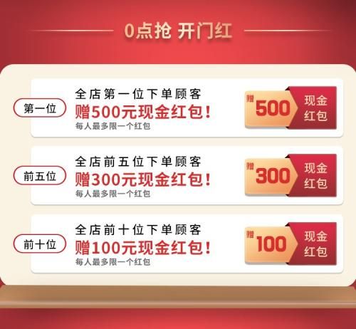 福利三:0点抢开门红!全店第一位下单顾客,即赠500元现金红包;前五位下单者,即赠300元现金红包;前十位下单者,即赠100元红包。