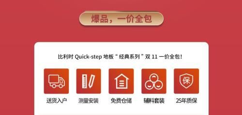 福利一:得高Quick-step“经典系列”一价全包活动!Quick-step经典系列精美且极具个性,外观自然、生动、优美,双11打包价259元/平,包含免费仓储、365天保价服务、送货入户、专业测量、免胶安装、地板辅料(国产地垫、地膜、木塑踢脚线、金属压条)、三重质保。