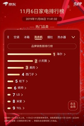11月6日,京东发布双11家电排行榜,年轻家电Leader洗衣机位列TOP6。