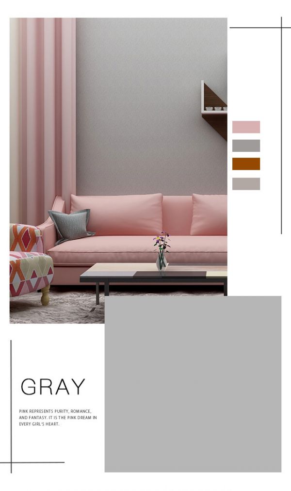 灰色给人理智、冷静和平和的感觉,粉色则凸显出浪漫和活力的氛围。将这两者结合起来,既有硬朗而不失优雅的气场,也有柔软而不失时尚的内饰,刚与柔的完美调和,动与静的相互牵制,不但不显得牵强,反而可以缔造出满满的高雅质感。