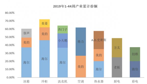 从各产业的市场表现看,在冰箱、冷柜、洗衣机等市场,海尔占据较大优势,分别以37.3%、46.1%、36.9%的累计份额排在首位;在空调市场,格力、美的以34.9%和26.9%的份额占据了行业总量的六成;在热水器市场,A.O.史密斯、海尔、美的位列前三,份额分别为22.4%、20.3%、14.8%;厨电市场老板25%、方太23.6%;彩电市场海信20.3%、创维17.2%。