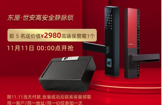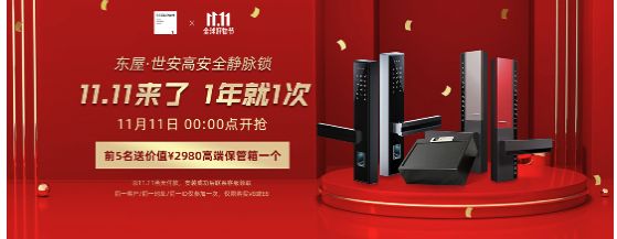 从不打折的东屋·世安锁具将在今年双十一“破例”,为消费者带来超值钜惠。11月11日当天,去天猫、京东、华为商城搜索“东屋·世安”加购,除可享受大额满减还有机会领取高端赠品。