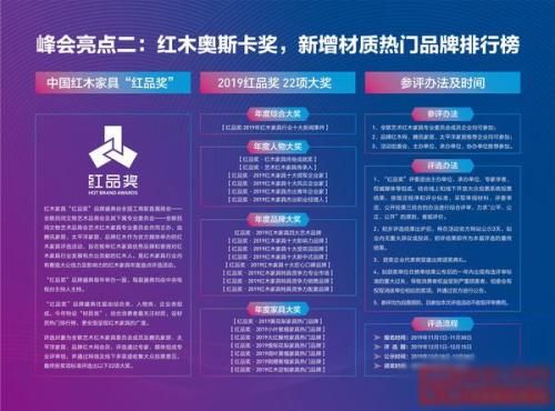 作为红木行业的年度总评活动,“红品奖”品牌盛典在延续往届综合类、人物类、品牌类奖项的基础上,今年将特别设立年度家具大奖,聚焦目前消费市场较为关注的黄花梨、小叶紫檀、大红酸枝、缅甸花梨、刺猬紫檀、阔叶黄檀等几大材质的家具热门品牌,以及红木定制家居热门品牌,更全面地呈现红木家具的广度。它也将继续聚焦红木品牌在企业管理、市场营销、社会责任、创新能力等方面的表现,以更严格的评选机制、更实效的品牌视角向行业与市场展示一个全新的、更公信的权威榜单。