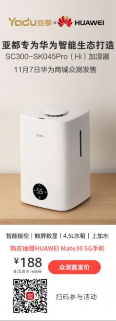 亚都SC300-SK045Pro(Hi)加湿器目前正在华为商城上线众测,仅售188元,下单还送亚都KHF-157型一次性口罩5只。同时还有机会获得华为AI音箱、亚都KJ500G-P4D净化器、华为Mate30 5G 全网通手机哦!