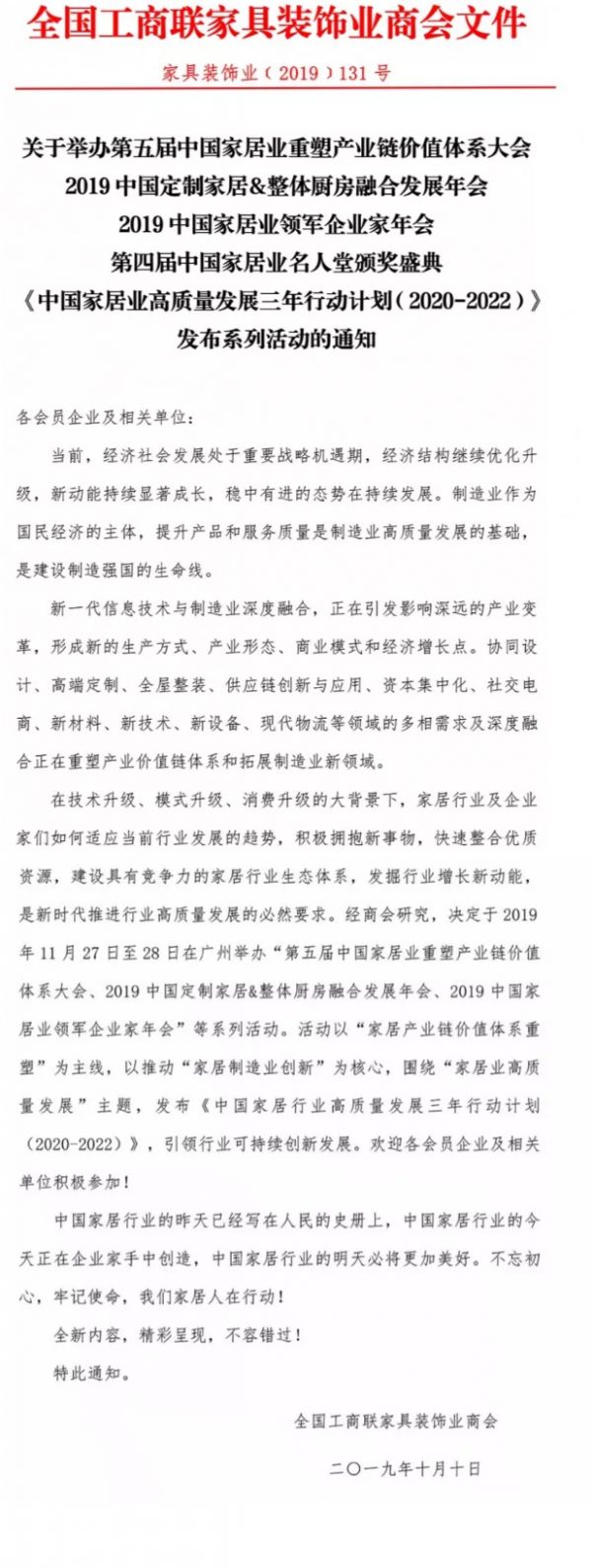 全国工商联家具装饰协业商会近期发布红头文件,将于11月底举办第五届中国家居业重塑产业链价值体系大会,大会关键词为重塑、产业链价值、高质量发展、领军企业家、全屋整装、社交电商、“互联网+家居生态圈”、现代物流、新材料、新技术、新设备。