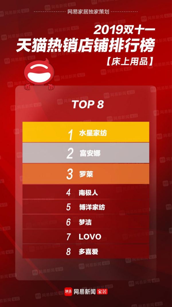 网易家居最新整理出“住宅家具”(天猫)、“全屋定制”(天猫,含新零售)、“家装主材”(天猫,含新零售)、“床上用品”(天猫)四大类目表现优秀的热销品牌榜单——