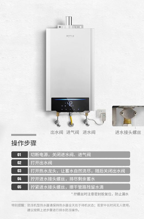 在明确了解燃气热水器机型之后,再来看看具体防冻措施: