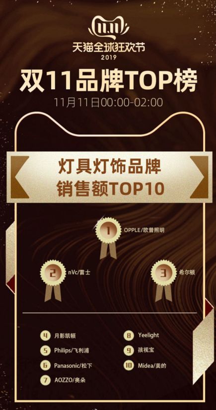 据天猫官方天猫美家发出的双十一品牌TOP榜显示,11月11日0时至11月11日凌晨两点,天猫灯具灯饰类目品牌销售额TOP5分别是欧普照明、雷士、希尔顿、月影灯饰和飞利浦。