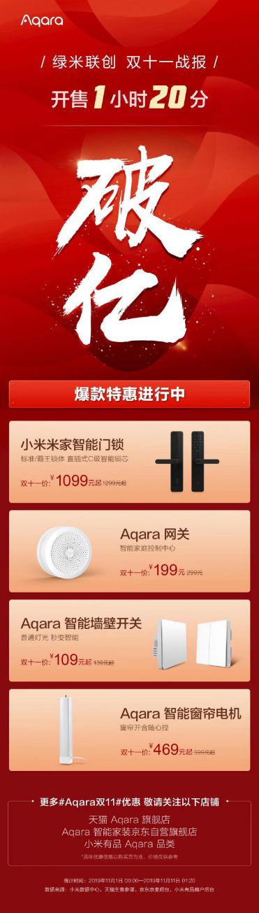 2019年双11盛典狂欢开启后,作为国内智能家居与物联网的第一品牌,绿米联创也再次创造了新的记录,在短短1小时20分钟时间里,智能家居全品类全网销售额突破亿!