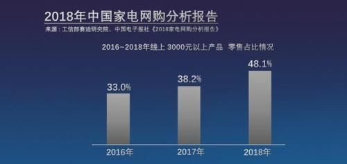 不仅是总体销量的攀升,高端家电在这当中也显示出了极强的增长势头。在工业和信息化部赛迪研究院、中国电子报社发布的《2018家电网购分析报告》中显示,线上3000元以上高端产品的销售额占比已经达到48.1%。