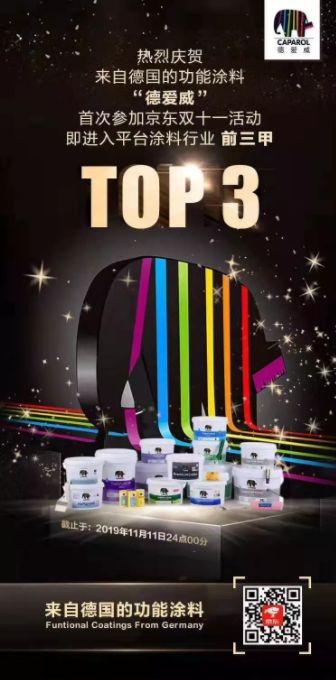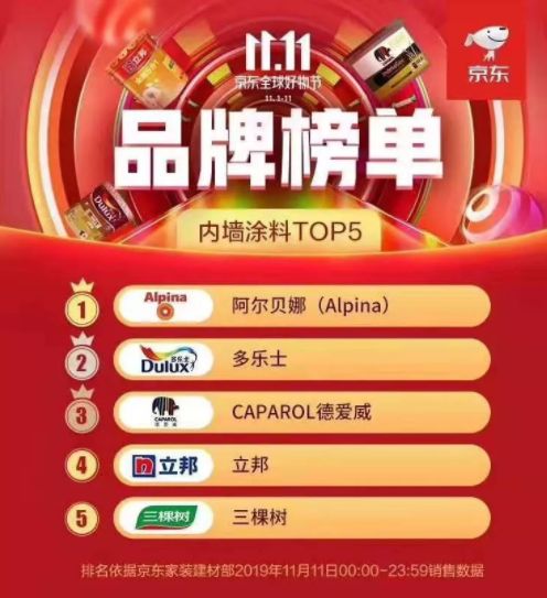 首次参加京东双十一即进入内墙涂料榜单TOP3