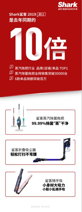 据悉,对于2018年4月才进入中国上次的鲨客来说,今年是其参加的第二届双十一。去年在双十一正式开售当天上午8点,鲨客蒸汽除菌拖把P3单款销售就已突破百万,Shark蒸汽除菌拖把从零起步,快速登上行业第二名宝座。今年自3月起连续七个月霸榜天猫蒸汽拖把行业第一位置,11月11日当天更是在前30分钟全网销售额就超过去年双十一全天。
