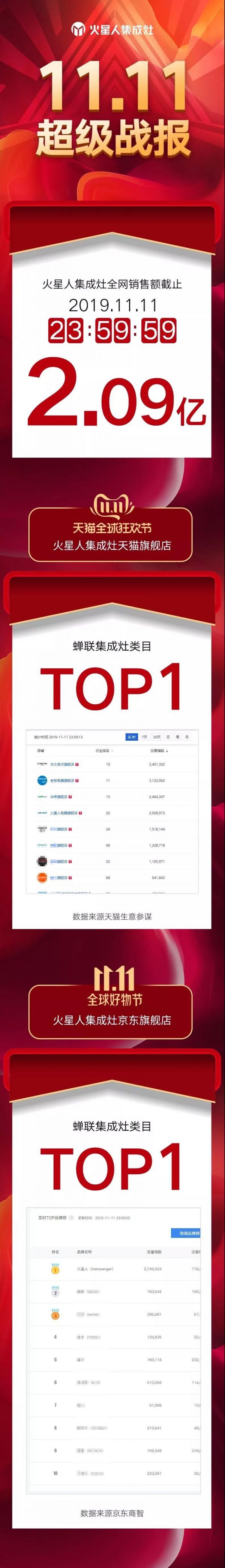 “一天两个亿”,火星人集成灶不仅圆满达成目标,实现自我超越,也依旧捍卫着天猫、京东 “集成灶类目首位”的位置,独傲群雄,遥遥领先!