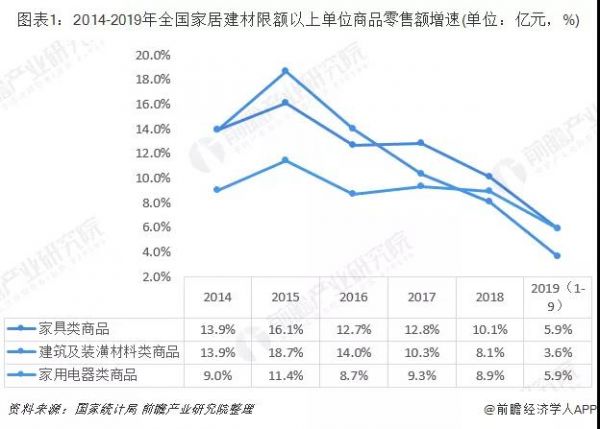 中小企业的生存空间遭遇挤压据国家统计局数据,2019年前三季度,家具类商品零售额为1396亿元,同比增长5.9%;建筑及装潢材料类商品零售额为1449亿元,同比增长3.6%;家用电器类商品实现零售额6517亿元,同比增长5.9%。