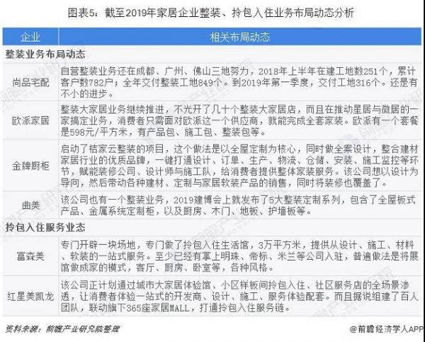 另一方面,精装房的配套部品种类在扩大,以前主要是涂料、地板、瓷砖、橱柜、卫浴洁具、门窗这些,现在增加了很多,比如智能家居、净水器等。全屋定制、整装入住渐成气候2018年的时候,全屋定制受到广泛追捧,很多做衣柜、橱柜等柜类产品的企业,还有成品家具企业、木门企业等,都在推全屋定制。在比较长的一段时间里,当时主要立足于自己的优势产品,比如全屋柜类定制、全屋木门定制、全屋瓷砖定制等,整个表现是围绕单品做文章,力图在某个细分品类里打造爆款。而2019年的情况有所变化,部分公司做了调整,开始向全屋配齐扩张,不光是做自己的优势产品,还可能自建生产线、投资某些公司,继续扩大品类,走大家居路线的全屋定制,把柜类产品、软装等全部搞定。