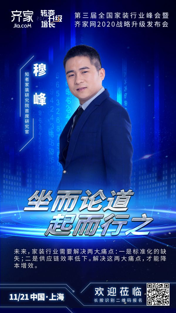 目前,知者家装研究院首席研究官穆峰确认出席“第三届全国家装行业峰会暨齐家网2020战略升级发布会”,届时将通过圆桌讨论的方式,分享其在家装领域的研究成果。