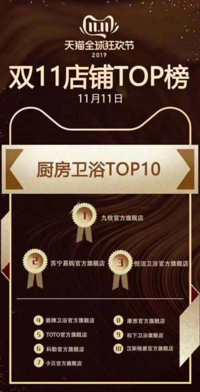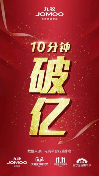 今年双11,九牧再一次用自身实力接连创造新纪录,蝉联家装卫浴行业十连冠!10分钟破亿,销售额比同期增长36%!