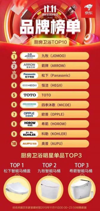 从11月11日零点开始,九牧的销售数据全线飘红,在智能马桶、浴室柜、厨房龙头、面盆龙头等核心品类斩获第一,刷新品类销售记录。