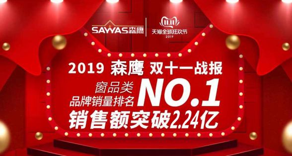 森鹰稳居天猫双11窗品类销量排名第一, 销售额突破2.24亿