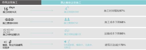 惠达住工整体浴室的另一大突破就是安装施工与售后服务。在施工方面,能有效避免繁琐施工,目前,惠达住工整体浴室的装配过程只需要2个人在4-6小时内就可以完成,真正实现了即裝即享,施工如堆积木一样简单。根据惠达住工方面的实际操作验证,相比于传统浴室施工,惠达住工整体浴室施工时间缩短了97%,施工成本下降了68%,运输成本下降了80%,建筑污染减少了70%。同时,在安装售后服务方面,惠达住工在惠达6S精致服务标准的基础上,对整体浴室的15大项46分项的节点全程管控,能做到在每一个安装节点都能有效地规避隐患,从底盘、墙壁、天花到洁具等部品的安装都做到逐一自检。