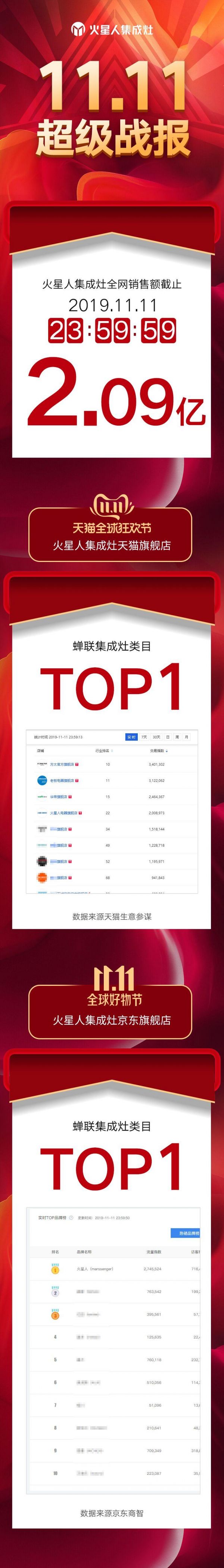今年是集成灶品牌火星人连续第五年参加双十一购物节,截止到11月11日23点59分59秒,火星人最终以全网2.09亿元的销售额,毫无争议的再次蝉联集成灶类目的销量冠军。其中,天猫实现销售1.16亿元,成为天猫双十一299个亿元俱乐部成员之一。