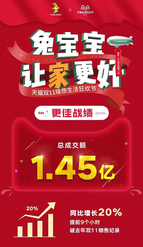 双11,兔宝宝提前9个小时破去年记录,全天销售额1.45亿