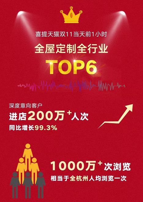 “双11”全民购物狂欢节,兔宝宝又交出一张漂亮的战报:全天销售额1.45亿,同比去年增长20%;提前9个小时,破去年销售记录。同时当天前1小时,兔宝宝获得全屋定制全行业TOP6。