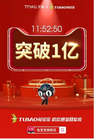 值得一提的是,在“双11”开场的前一分钟,兔宝宝销售额便突破3000万元,当天上午11点52分50秒,销售额突破1个亿。