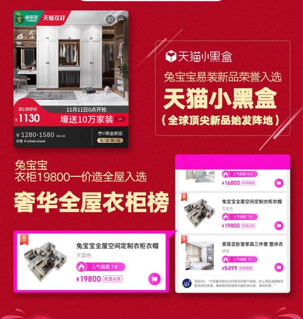 根据天猫最终榜单显示,今年共有100万款新品在天猫“双11”首发,兔宝宝易装新品入选天猫小黑盒,和其他298个品牌共同入围“亿元俱乐部”。