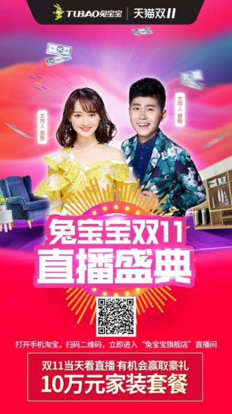 在今年“双11”中,兔宝宝采用了旗舰店店铺直播加导购报名直播的玩法,线下门店多位导购通过淘宝直播平台,对兔宝宝品牌以及所在门店进行线下宣传,当晚8点的杭州旗舰生活馆,还进行了长达1.5个小时的直播,吸引了上千位观众进行观看。
